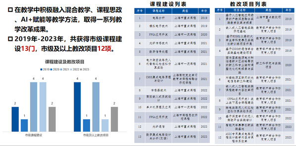 市级一流课程与重点课程方面:《FPGA应用开发》《电力架空线路无人机智能巡检虚拟仿真实验》《单片机原理及应用》分别获批上海市一流线下、虚仿和线上课程,《电路分析》《模拟电子技术》《光纤传感技术》等10门课程获批上海市重点课程。《基于人工智能应用场景的产教深度融合实践教学改革与探索》获上海市重点教改项目。