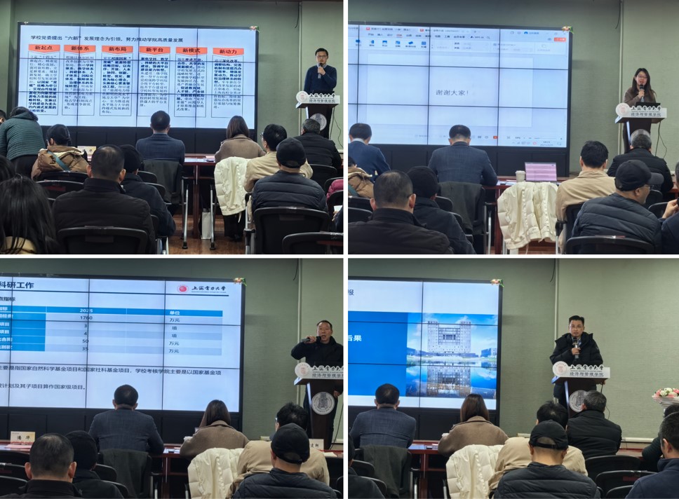 学院党委副书记、常务副院长潘华围绕“六新”理念,阐述“一体两翼”的学科、学位点和专业建设新布局,以及学院未来总体发展思路,并总结目前学院发展的不足和未来努力的方向和举措。他代表学院班子介绍2025年度在基层党建、师资队伍、学科建设、科学研究、人才培养、学生工作、国际交流等方面的重点工作规划,鼓励全体教职工凝心聚力,开创学院高质量发展新局面。