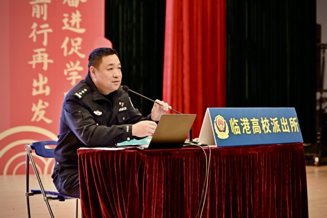 王旭介绍目前学校反诈情况,呼吁全体同学将所学信息内化于心、外化于行,共同营造安全和谐的校园环境。
